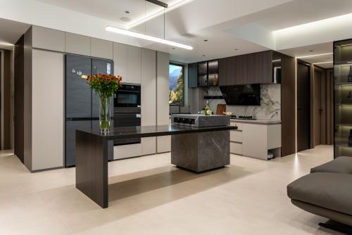 每寸空间都被精心规划,开放式厨房满足烹饪的各种需求,深棕色收纳柜散发着低调的奢华,浅色的烹饪台沉稳而不失明亮,两者相得映彰,赋予厨房一种独特的视觉张力。